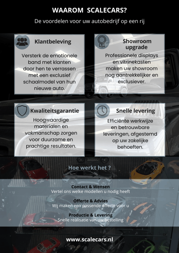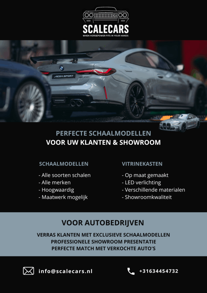 Bij Scalecars bieden we gedetailleerde modelauto’s aan ( met/ zonder een vitrinekast ) voornamelijk in schaal 1 : 18. We begrijpen dat niet elk model in de gewenste kleur of uitvoering beschikbaar is. Daarom streven we ernaar om modellen te leveren die zo dicht mogelijk aansluiten bij jouw wensen. Of je nu op zoek bent naar een specifieke kleurstelling, uitvoering of merk, wij denken graag met je mee om het perfecte model te vinden.